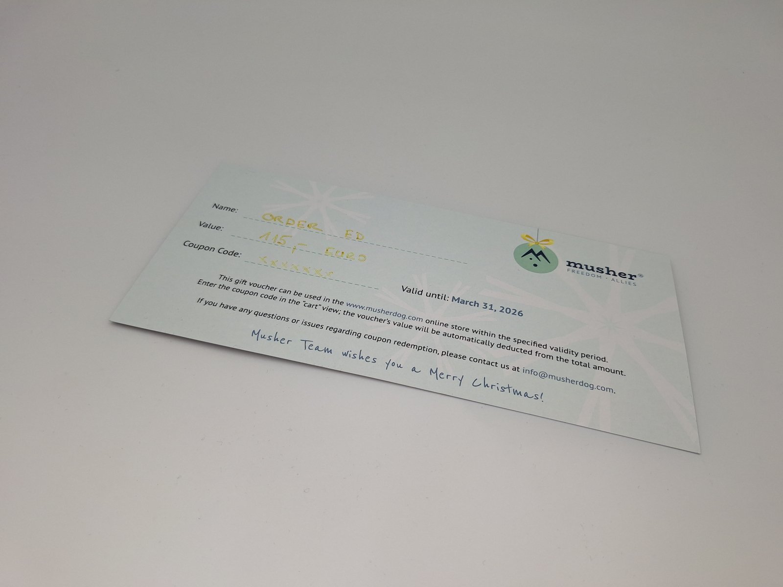This year, Musher is preparing something truly special for Christmas! Surprise your dog-loving friends and family with a personalized shopping voucher that will be waiting under the tree – in a real, tangible envelope.