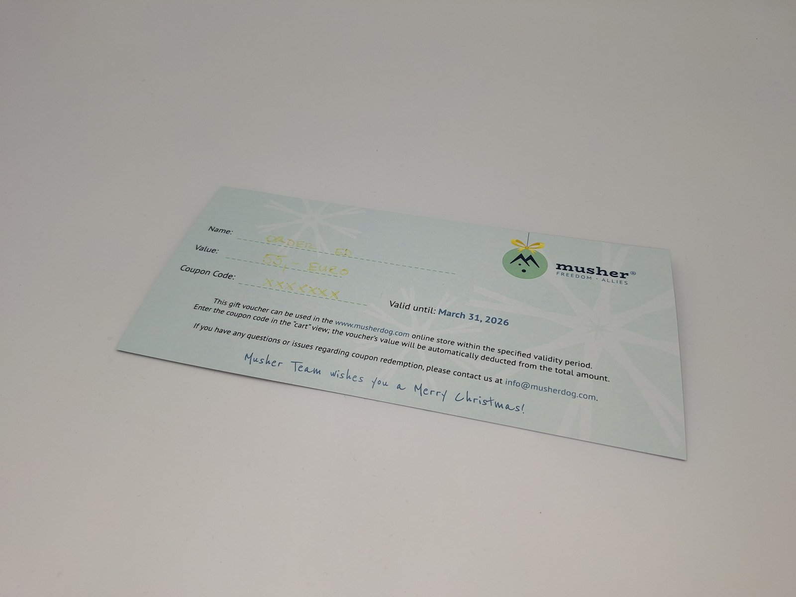 This year, Musher is preparing something truly special for Christmas! Surprise your dog-loving friends and family with a personalized shopping voucher that will be waiting under the tree – in a real, tangible envelope.